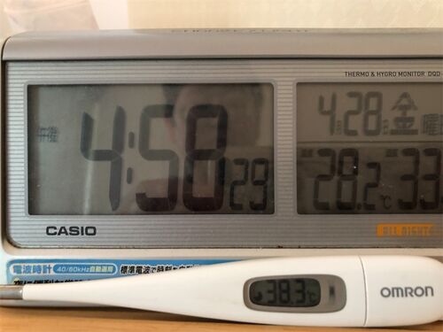 5時🕔台にまた熱が上がり⬆️⬆️⬆️⬆️38.3℃へ⬆️⬆️⬆️その後プレドニン2錠➕カロナール2方➕プリンペラン➕アルサルミン内服するそして今日はお弁当🍱の日なので丁度汗かいてて💦💦あせで下着が気持ち悪いので、着替えて18:45 37.3℃へ⬇️⬇️⬇️下がってたこれだったら早く下がる…
